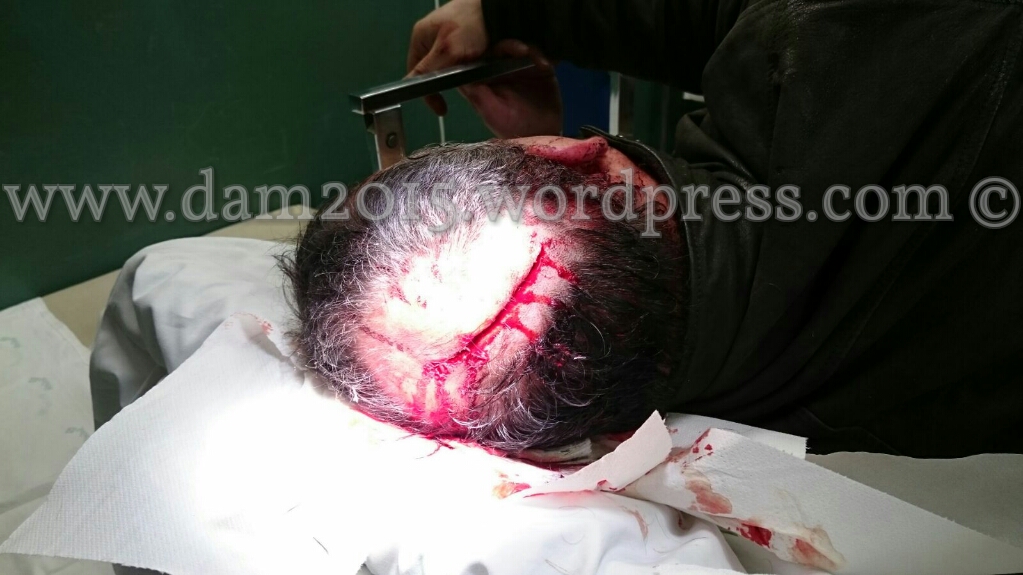 Vasta ferita lacero contusa della regione parieto-occipitale con esposizione della calotta cranica.