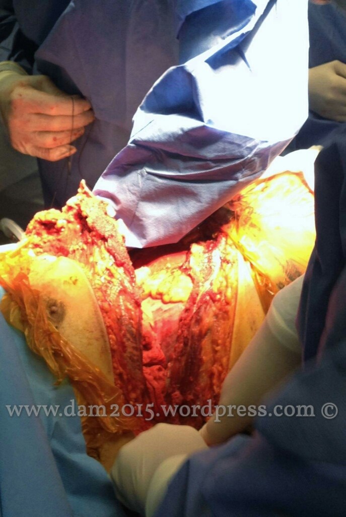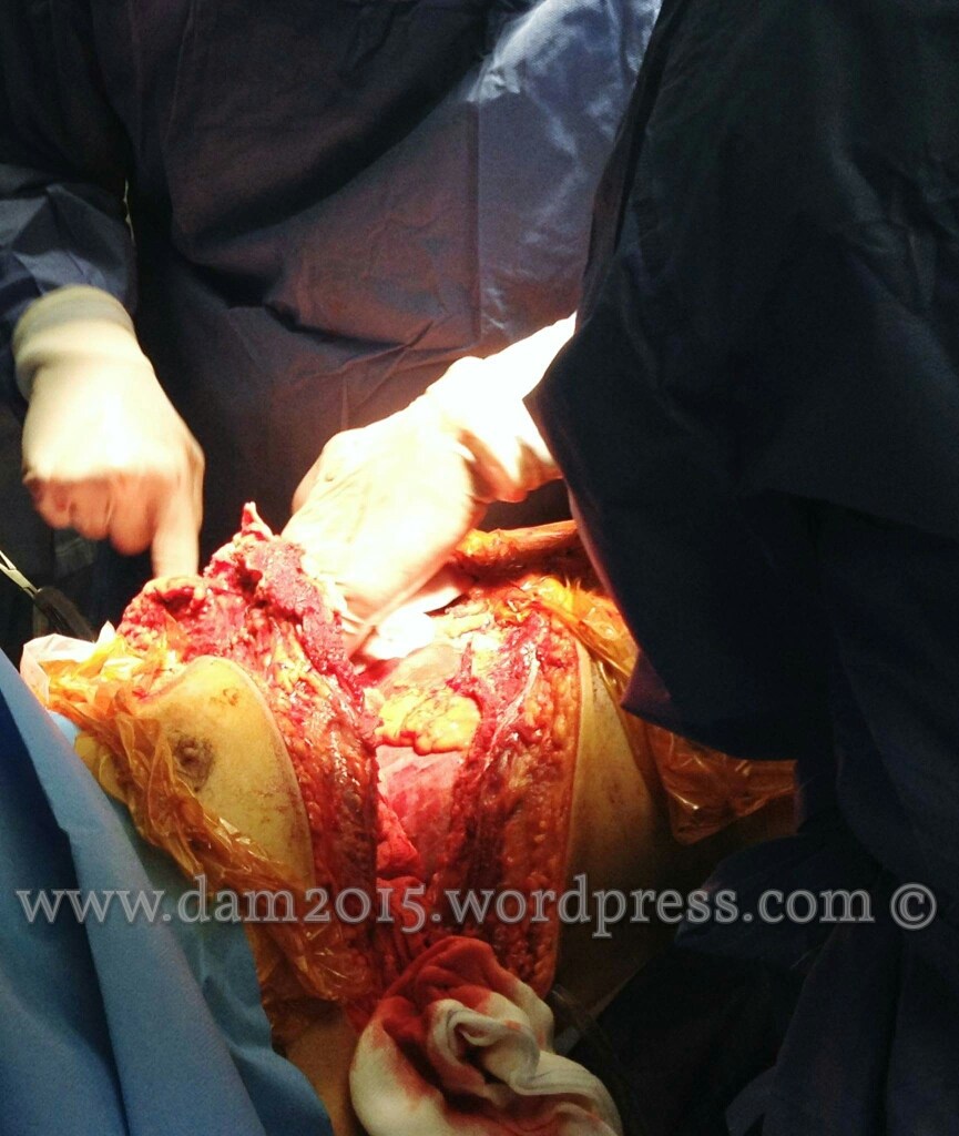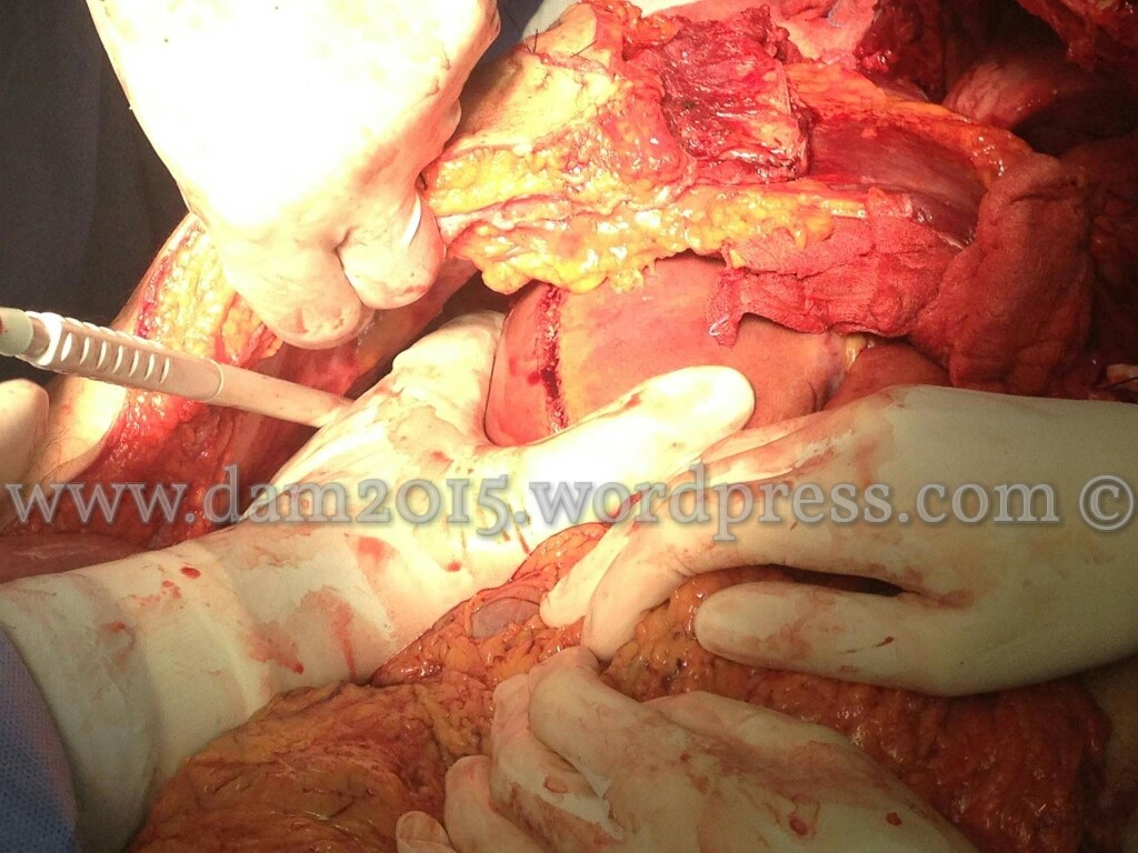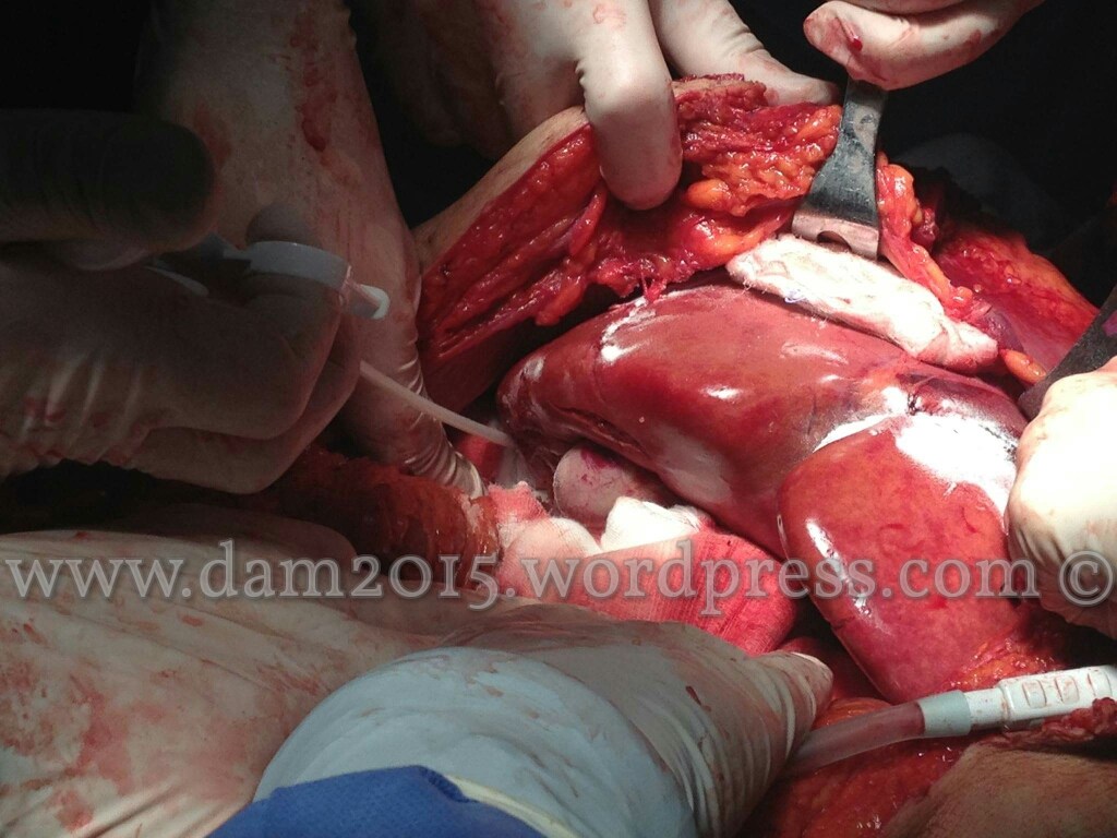 Si esegue laparotomia xifo-pubica. Emoperitoneo. Lesioni epatiche multiple del lobo destro e sinistro (V grado). Packing epatico ed applicazione di AHP (Absorbable Hemostatic Particles).