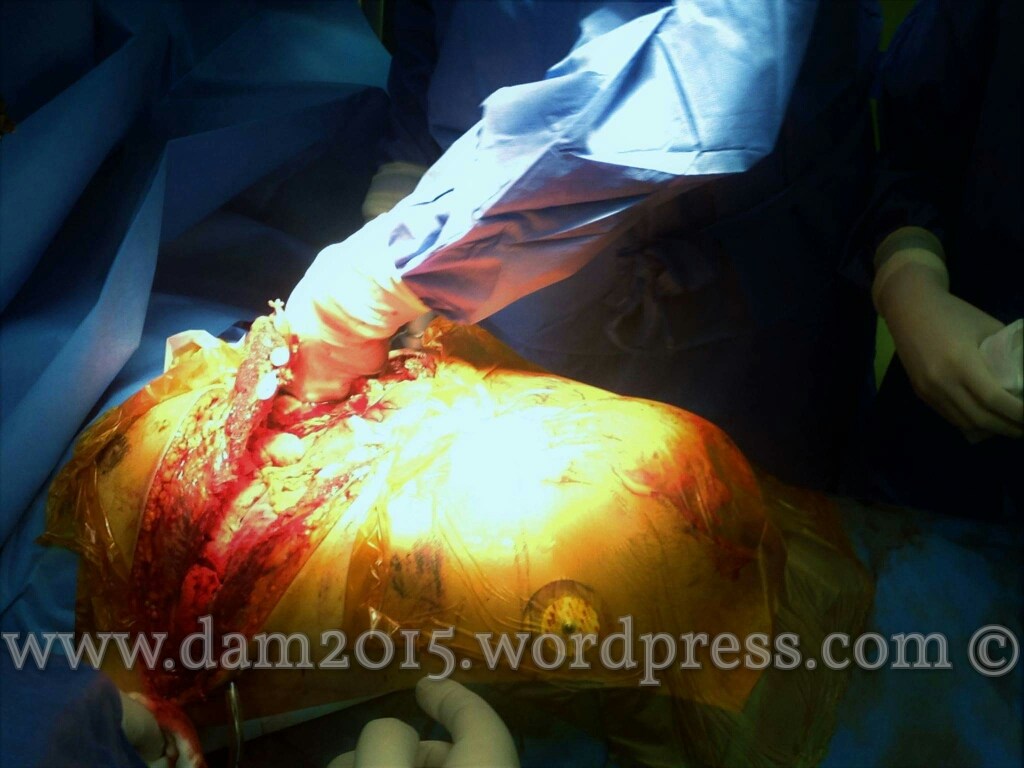 Tamponamento cardiaco. Toracotomia bilaterale come da ampliamento della toracotomia Dx precedentemente effettuata. Massaggio cardiaco interno.
