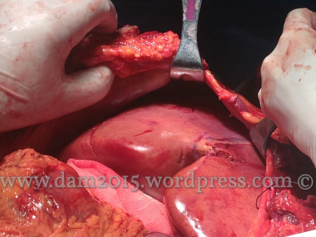Si esegue laparotomia xifo-pubica. Emoperitoneo. Lesioni epatiche multiple del lobo destro e sinistro (V grado). Packing epatico ed applicazione di AHP (Absorbable Hemostatic Particles).