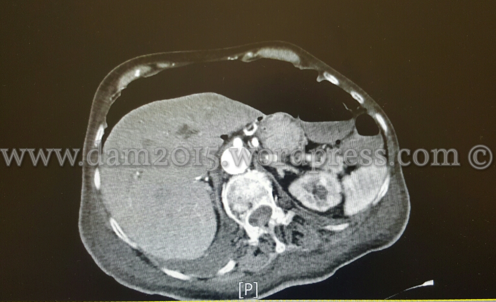 Eseguita TC addome con MDC che documenta abbondante quota di aria libera in sede sottodiaframmatica come da perforazione di viscere cavo (verosimilmente della parete anteriore del cieco).