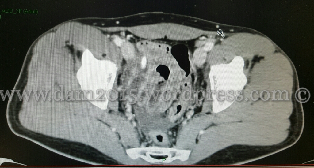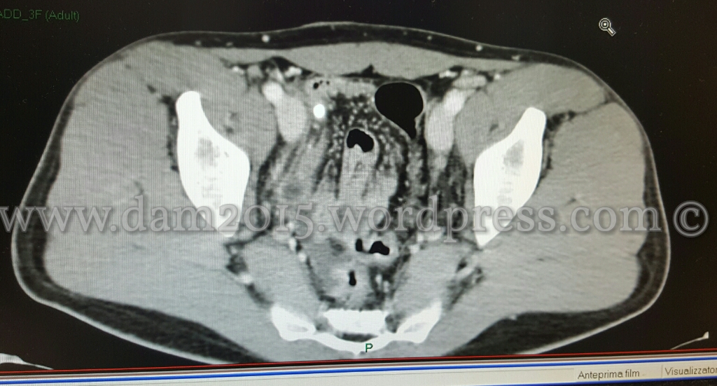 Alla TC con mezzo di contrasto si evidenziava distensione fluida dell’appendice cecale a localizzazione pelvica, nel cui lume si apprezza appendicolita.