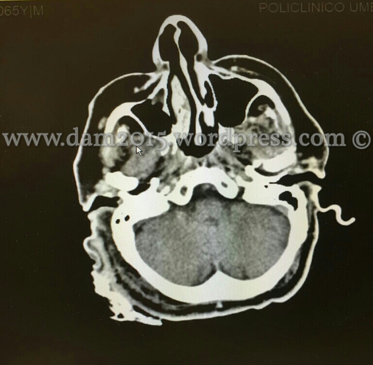 Paziente uomo 65 anni, giunge al dipartimento di emergenza tramite elisoccorso per caduta di un grosso ramo sulla regione cranio-facciale destra.