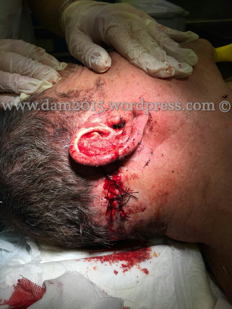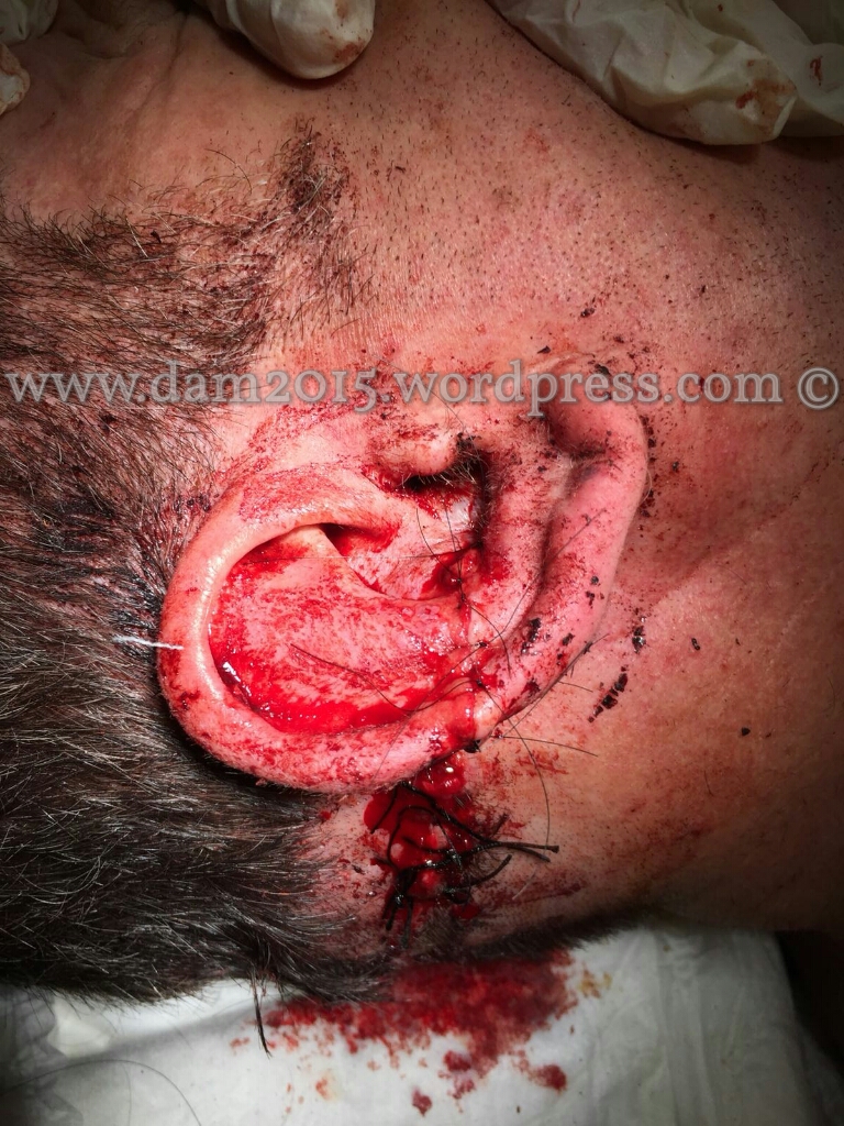Dopo abbondanti lavaggi con H2O2 e iodizzazione del campo, si pratica anestesia locale. Si rimuovono residui cartilaginei e si effettua sutura a punti staccati con seta 3-0 della FLC in regione retroauricolare dx e successivamente la sutura di elice, antelice, superficie laterale e superficie mediale del padiglione auricolare dx a punti staccati con nylon 5-0. Si esegue medicazione di copertura. Si somministrano Ig tetano e terapia con amoxicillina+acido clavulanico 2g x 2. Si trattiene il Pz per osservazione clinica e ulteriori accertamenti.