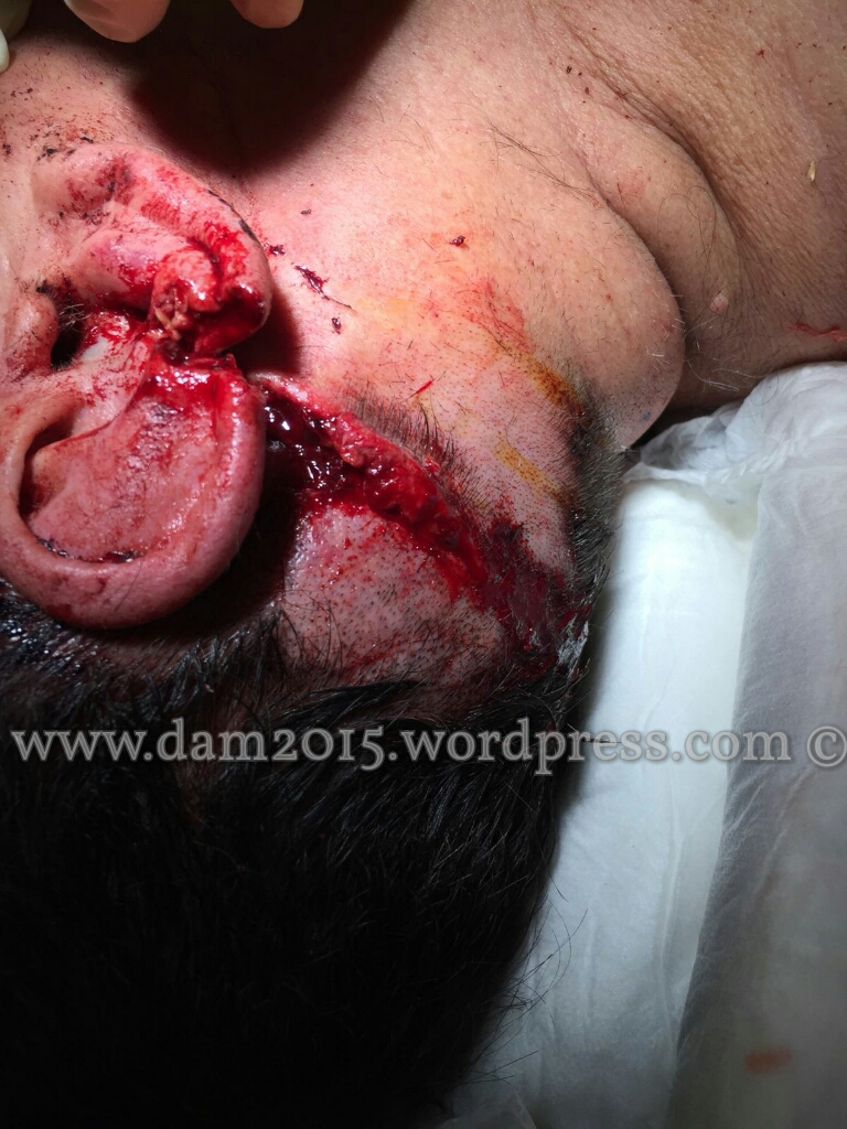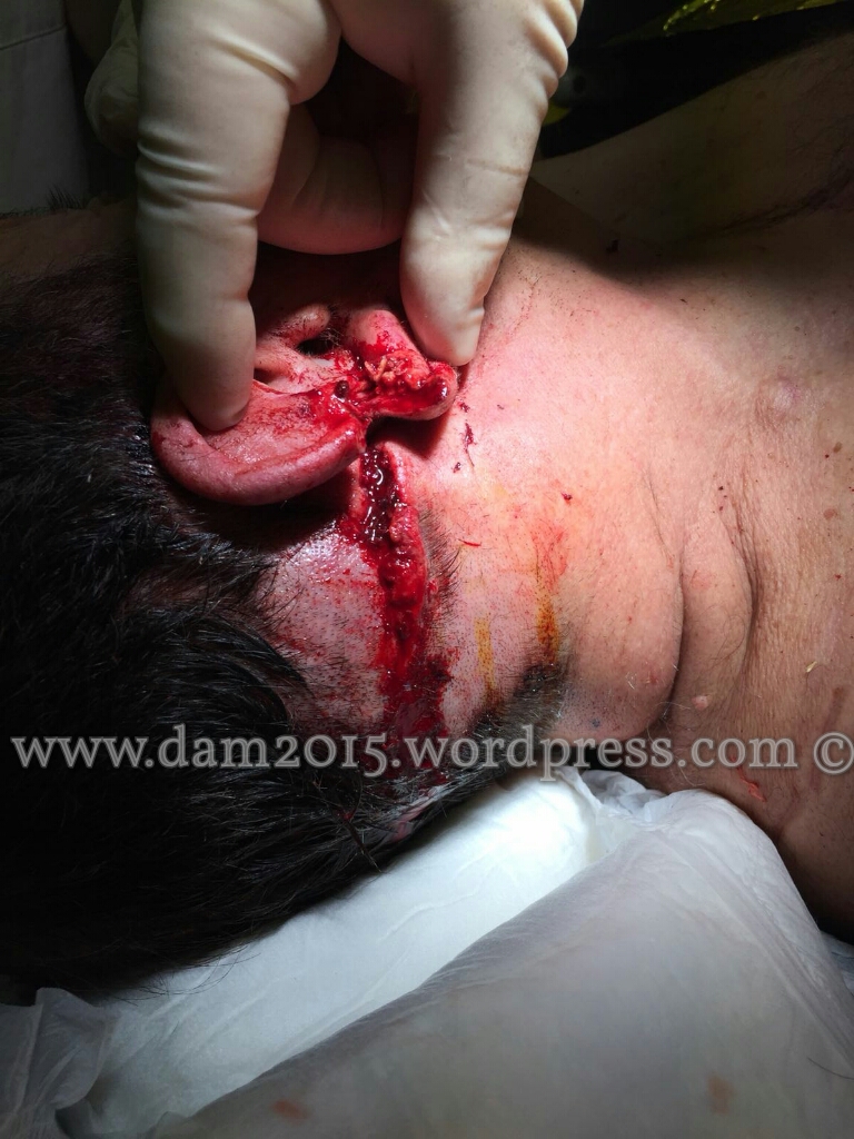 Dopo abbondanti lavaggi con H2O2 e iodizzazione del campo, si pratica anestesia locale. Si rimuovono residui cartilaginei e si effettua sutura a punti staccati con seta 3-0 della FLC in regione retroauricolare dx e successivamente la sutura di elice, antelice, superficie laterale e superficie mediale del padiglione auricolare dx a punti staccati con nylon 5-0. Si esegue medicazione di copertura. Si somministrano Ig tetano e terapia con amoxicillina+acido clavulanico 2g x 2. Si trattiene il Pz per osservazione clinica e ulteriori accertamenti.